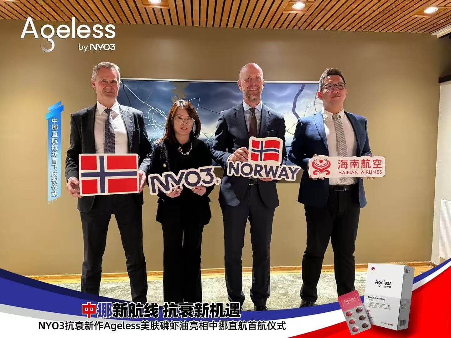 NYO3秉承“源自挪威 自然纯粹”的品牌理念,旗下Omega-3系列产品均通过ORIVO、IKOS等多项国际权威质量认证及欧睿国际市场地位认证,现已成为全球磷虾油品质标杆和销量领先的品牌。NYO3 抗衰产业线Ageless负责人冯娜表示:“中挪新航线,抗衰新机遇,依托海航的全球网络,NYO3将以优质产品构建起中挪健康方案的「空中桥梁」,为中挪经贸文化交流注入澎湃的健康动能!”