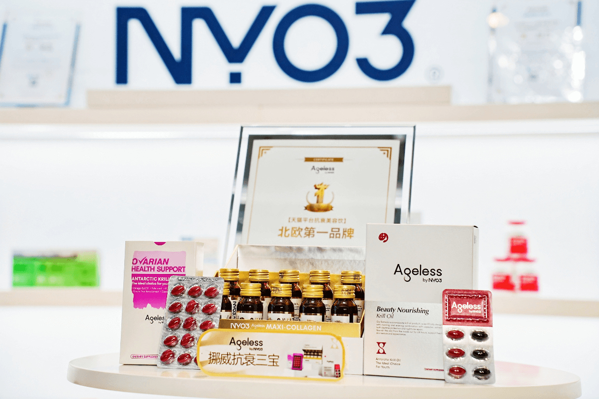以磷虾油产品为核心,NYO3已覆盖全球21国300余个核心渠道。在中国线上已进驻天猫、京东、盒马等主流平台,线下入驻港澳200余家门店。在中国市场这一核心增长引擎的推动下,2024年,NYO3跃升为“北欧第一抗衰品牌”,并于2025年斩获“连续两年全球磷虾油销售额领先品牌”认证。