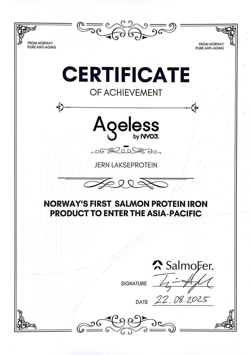 源头决定品质,世界级品牌选用世界级原料。此次两大企业的合作,既彰显了NYO3严格的原料甄选标准,更成为挪威企业“并船出海”的典范。双方融合挪威领先的健康科技与海洋产业优势,共同推出全球唯一海洋来源的天然铁剂——Ageless三文鱼铁,并被认定为“挪威首个进入亚太市场的三文鱼蛋白铁产品”,填补了亚太地区海洋来源蛋白铁行业的空白。