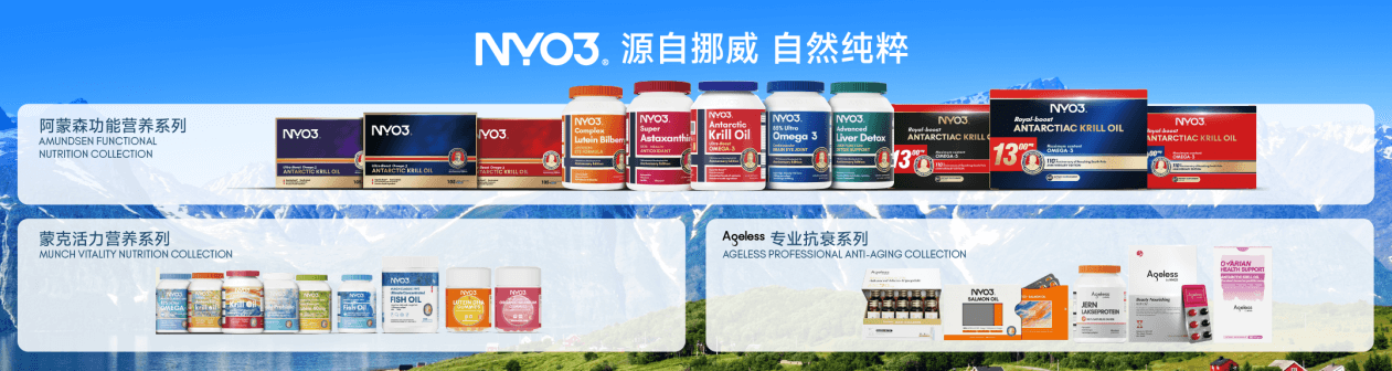 NYO3与挪威国家级学府奥斯陆大学、挪威权威抗衰研究中心NO-Age等挪威顶尖实验室深度协作,致力于将挪威独特营养元素与现代科技相结合,打造以“南极磷虾油”为核心的全健康周期专业膳食营养补充剂矩阵。目前,NYO3已成为全球磷虾油连续2年销售额领先品牌,以及全球高磷脂磷虾油销售额第一品牌。